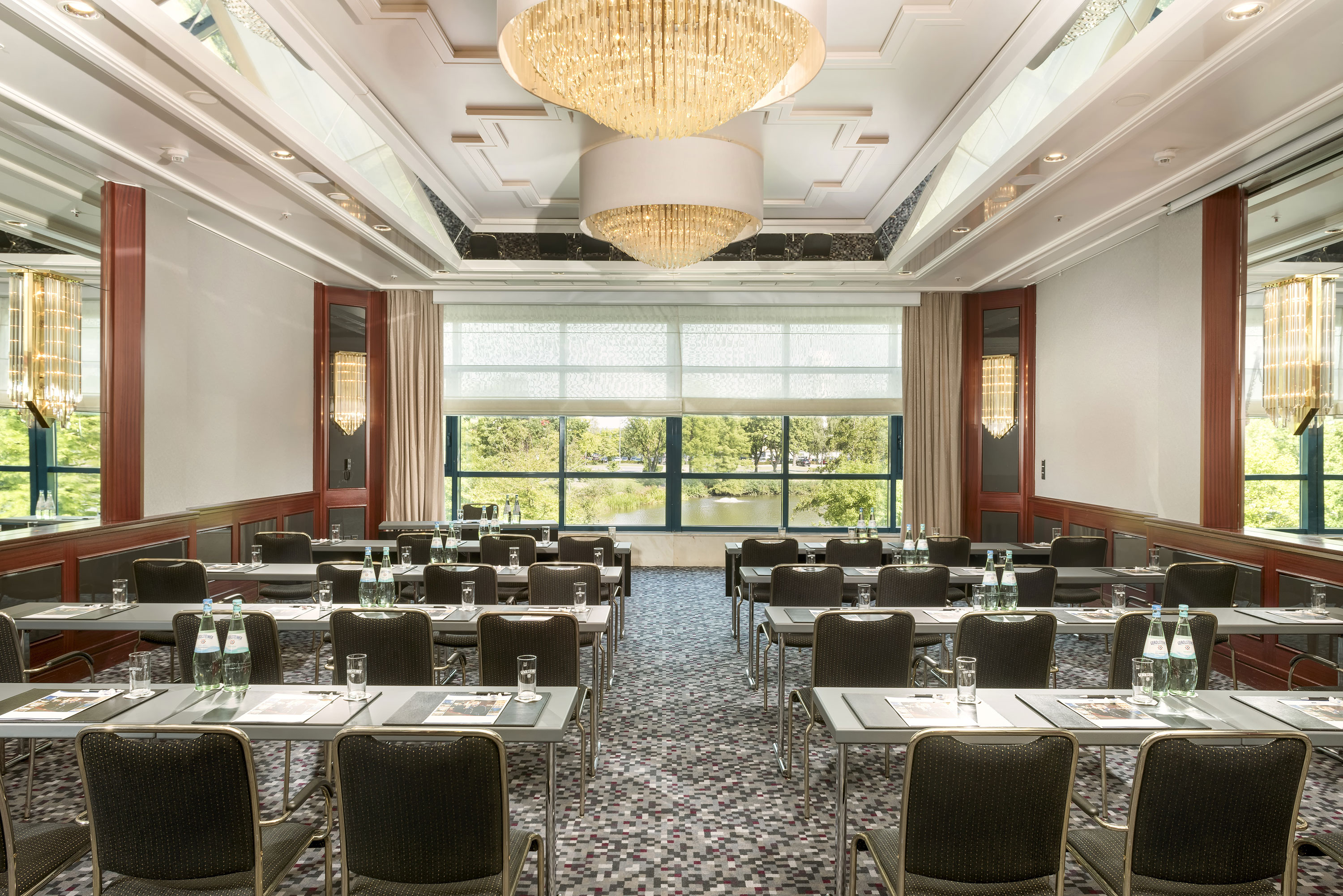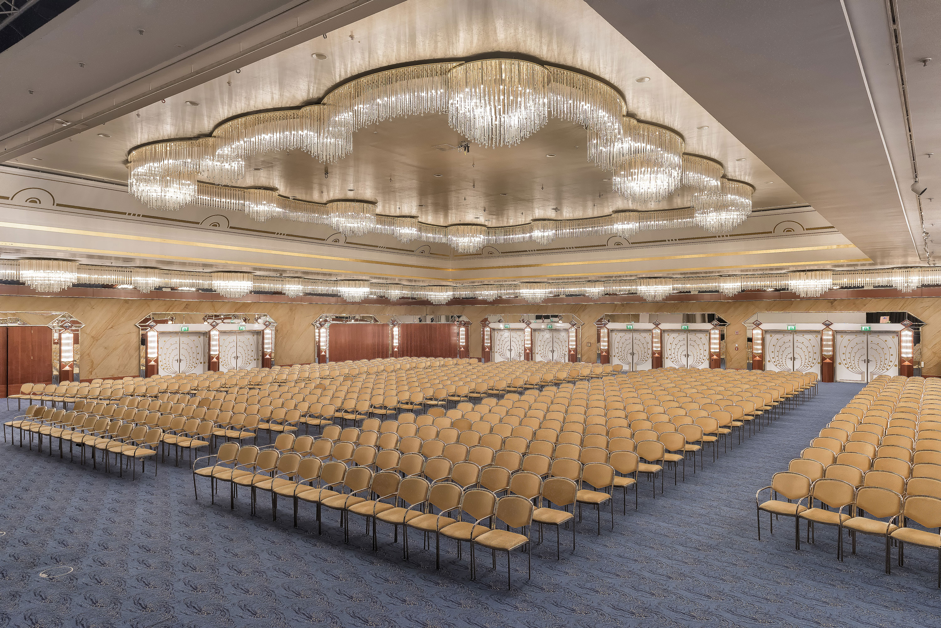 Elegant event hall with crystal chandeliers, row seating, and a large stage at Maritim Hotel Hannover.