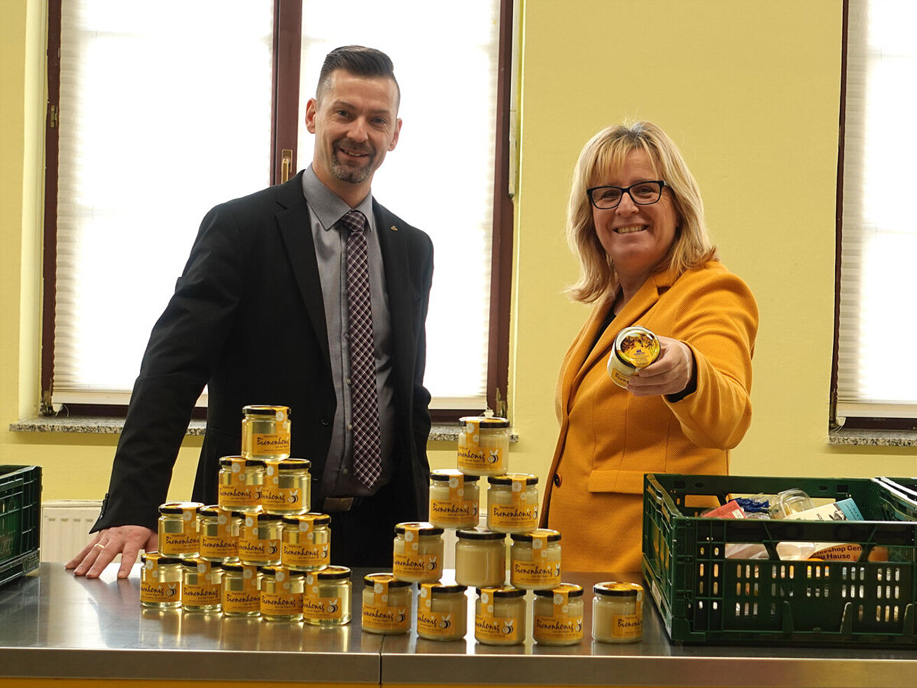 Two guests enjoying lunch in the restaurant of Maritim Hotel Magdeburg, with a view of the bar and kitchen in the background.