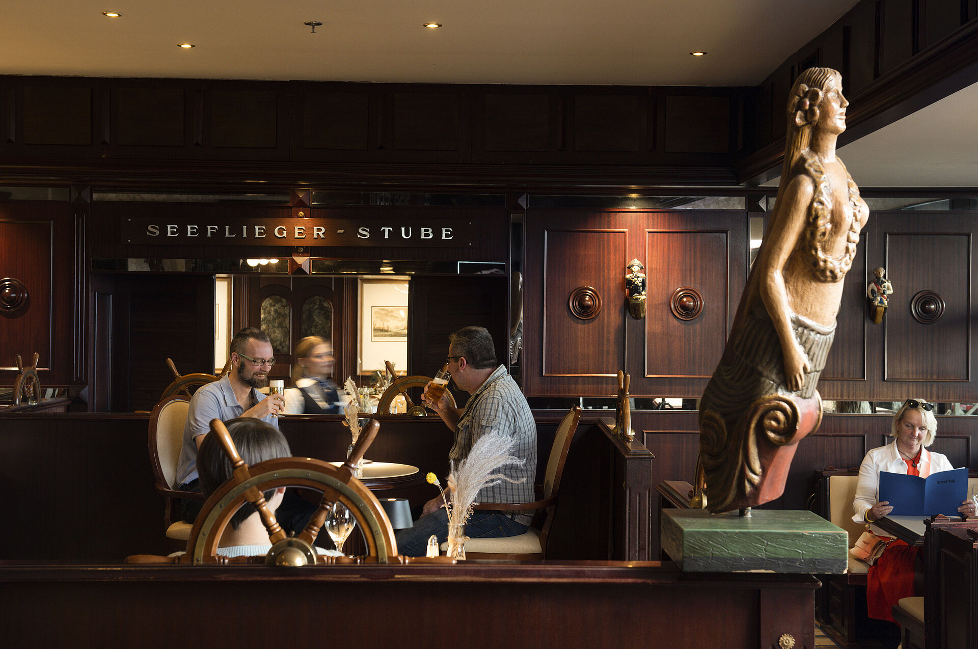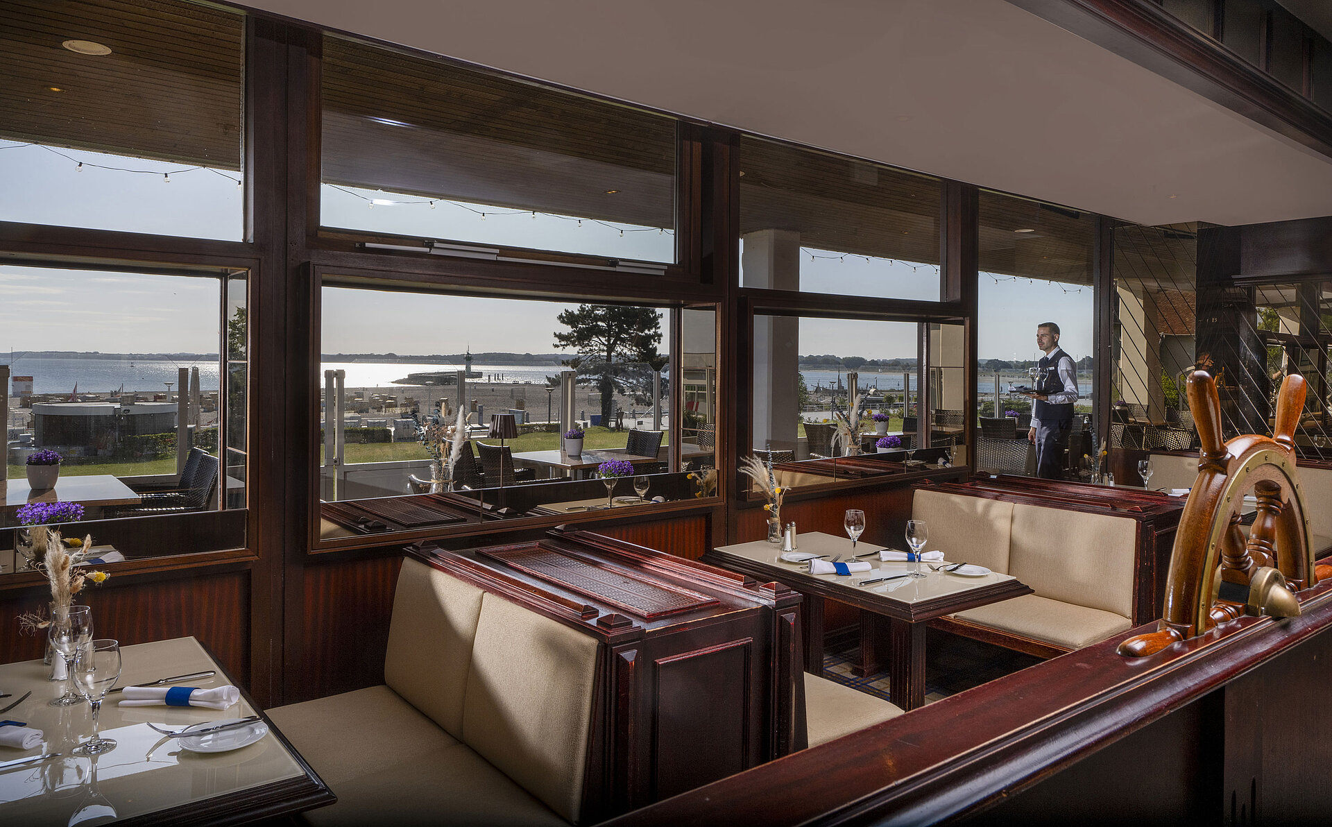 In a maritime pub atmosphere, you can enjoy delicious snacks, cakes and tartes in the afternoon and à la carte dinners with a magnificent view of the Baltic Sea.