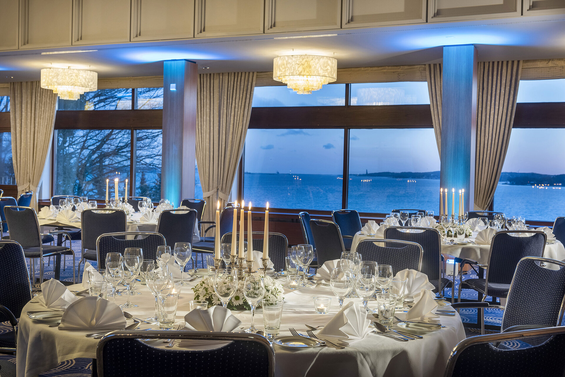 Ahoy there, event organisers! In the "Saal Maritim" (Maritim Hall) you can host seminars that are like a breath of fresh sea air and organise conventions that will stay in your guests’ memory just as salt from sea water lingers on your skin. Our function room offers a large stage, dance floor, adjoining foyer as well as a flexible room layout that can accommodate up to 450 people. This gives you the freedom to create the perfect ambience for stylish weddings, family celebrations, office parties, anniversaries, balls and just about any other kind of occasion when you’re looking for a top-class venue with a touch of luxury and opulence.